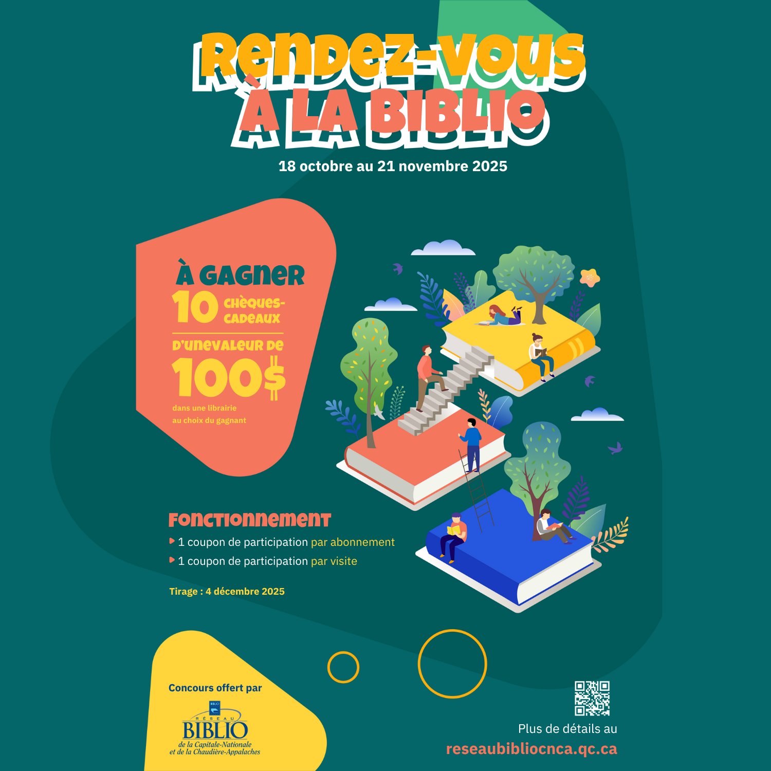 Le tirage des prix aura lieu le jeudi 4 décembre 2025 au centre administratif du Réseau BIBLIO CNCA. Les gagnants seront sélectionnés par tirage au sort parmi l’ensemble des participants.